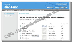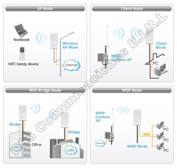 El AirMax5 puede funcionar como access point,cliente,bridge,WISP Router o AP Router. Por lo tanto, puede transformar instantáneamente el CPE a diferentes aplicaciones inalámbricas. Con la nueva interfaz de AirLogic,la configuración de web es mucho más fácil de usar. Simplemente inicie seleccionando un modo inalámbrico,el AirMax5 se mostrará sólo las opciones disponibles en ese modo inalámbrico.