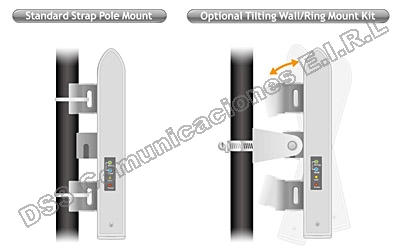 El AirMax5 está diseñado para ser montado usando las correas de plástico incluido para facilitar la instalación. Si se requiere un montaje en pared o otro tipo de montaje más rígido,se puede adquirir el Metal Wall Mount/Pole Mount Kit opcional. Permitirá al instalador ajustar el ángulo de mosaico para la alineación de antena más precisa.