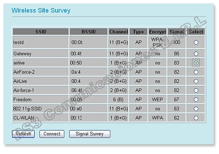 Durante una instalación WISP,el instalador tendrá que averiguar qué AP al aire libre ofrecen mejor señal en el área de conexión. La función inalámbrica de encuesta de AirLive proporciona una configuración paso de este proceso. En primer lugar,la página de la encuesta del sitio muestra que AP tiene la señal más fuerte. A continuación,el instalador realiza una alineación de la antena utilizando la función de estudio de la señal. Por último,el instalador simplemente hace clic en botón \u0026quot;Conectar\u0026quot; para establecer la conexión. El estudio del sitio está disponible incluso en modo AP,para que el instalador puede comprobar los canales utilizados en los alrededores de los acess point para evitar interferencias.