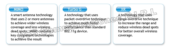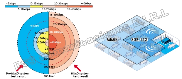 El resultado es una cobertura mucho mayor y una velocidad de hasta 3 veces más rápida que un equipo estándar inalámbrico 802.11g. Esto significa que a medida que la distancia aumenta,la velocidad MIMO-G disminuirá más lentamente que la de aquellas soluciones que no sean MIMO-G. Es completamente compatible con los dispositivos 802.11 g,802.11 b y Turbo-G,de tal manera que usted no tiene que desincorporar su equipamiento inalámbrico existente.