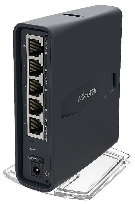 Dual band WiFi 2.4/5GHz, 5 puertos Gigabit, PoE salida, CPU 650MHz, RAM 64MB, RouterOS.
