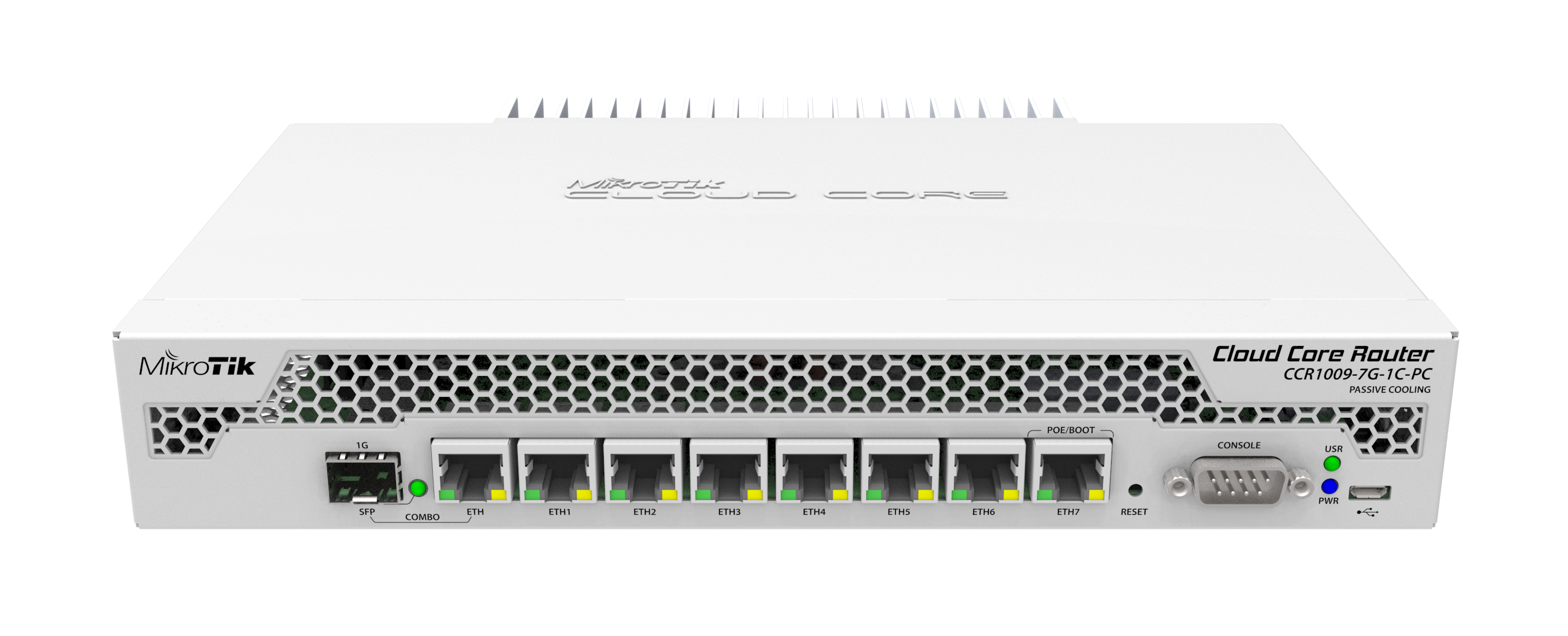 CCR1009-7G-1C-PC MikroTik Cloud Core Router 1009 - 7xGE, 1xCombo, 9 núcleos, 1GB RAM, Pasivo