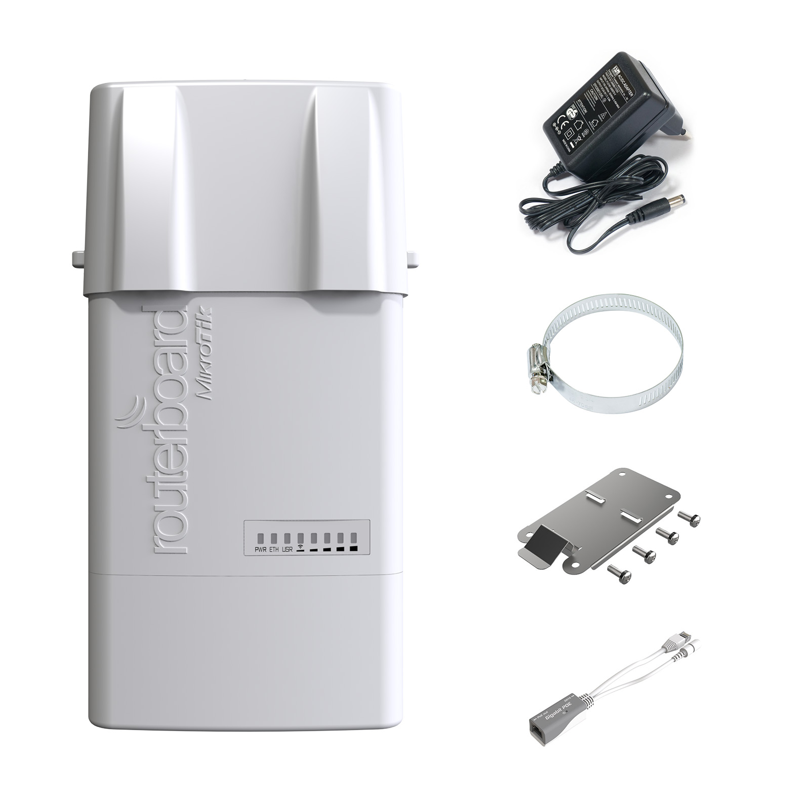 BaseBox5, AP/CPE 5.8GHz, 300 Mbps, 30 dBm, 1xGE, L4, PoE, fuente y montaje, MikroTik.
