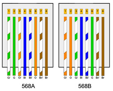 Para usar con un HUB o SWITCH hay dos normas, la más usada es la B, en los dos casos los dos lados del cable son iguales: