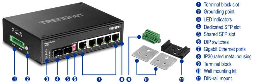 TRENDnet TI-G62 es un conmutador no administrado fiable IP30 DIN-rail con componentes endurecidos clasificados para entornos industriales extremos. Cuenta con 5 puertos Gigabit Ethernet, una ranura compartida SFP, una ranura SFP dedicado, y un 12 Gbps de capacidad de conmutación. Los interruptores DIP alternar entre el puerto y la ranura compartida Gigabit SFP y el conjunto admitido rendimiento ya sea a 100 Mbps o 1 Gbps. Las entradas duales redundantes de alimentación (fuente de alimentación se vende por separado: TI-M6024) y un tiempo de inactividad aplicaciones de soporte de disparo de salida de alarma falla de energía cero.