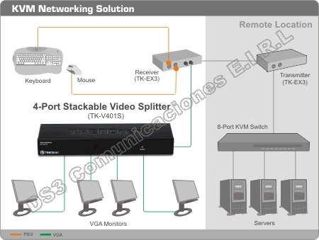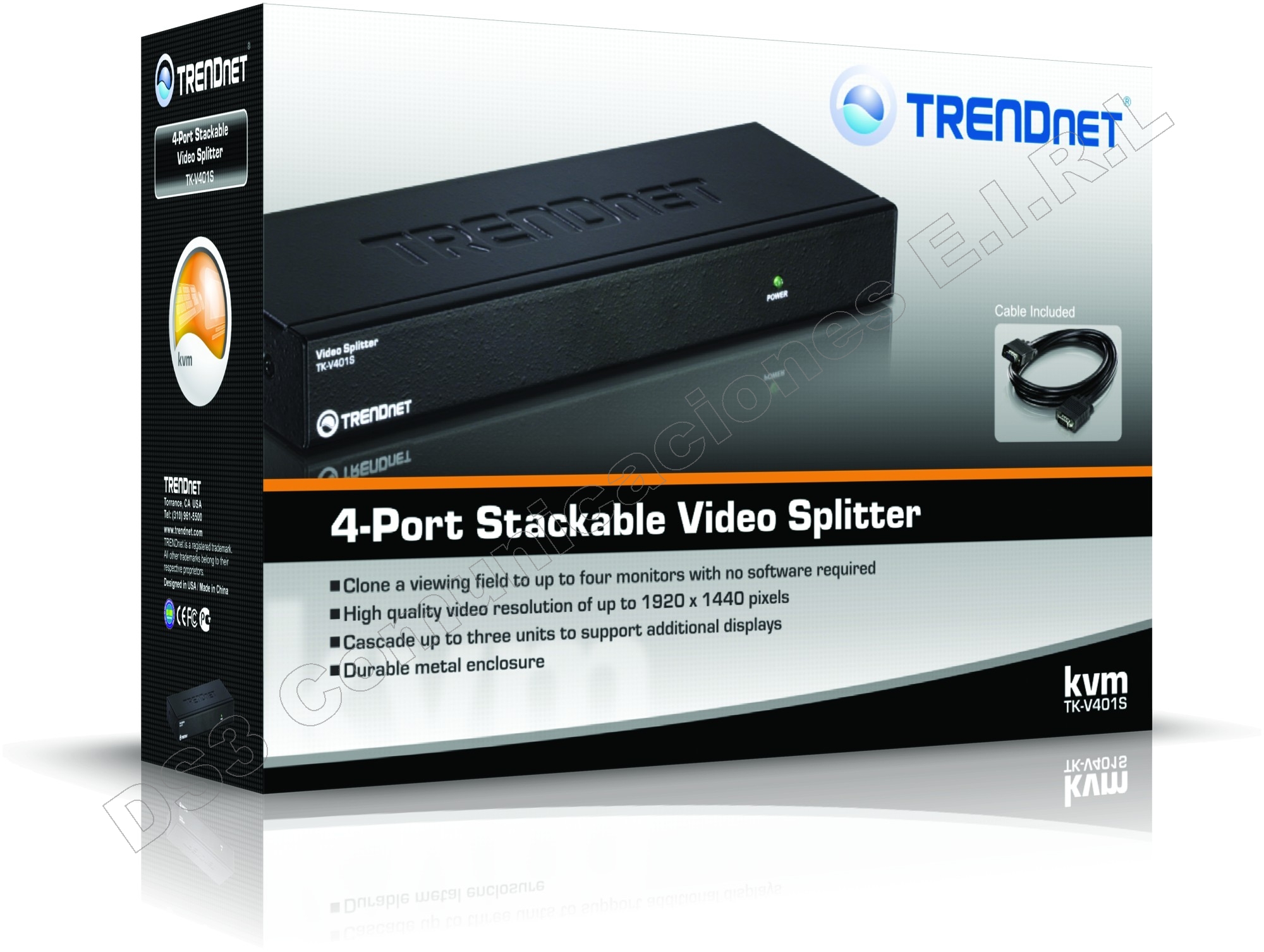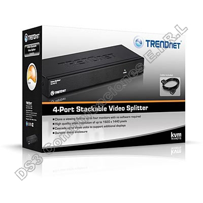 El repetidor de video apilable de 4 puertos (modelo TK-V401S) clona o repite el campo visual de su PC hasta en cuatro monitores (este producto no amplía un campo visual único en múltiples monitores). Ofrece una resolución de 1920 x 1440 píxeles, lo que garantiza una excelente calidad de imagen.