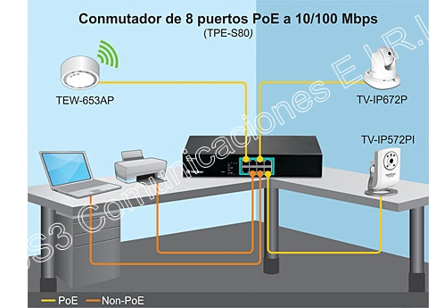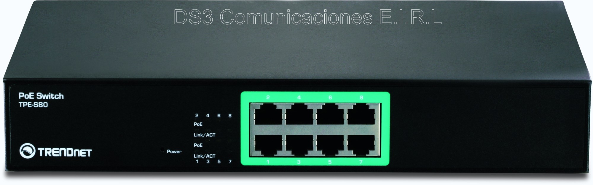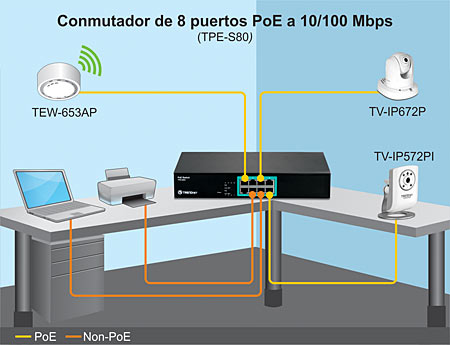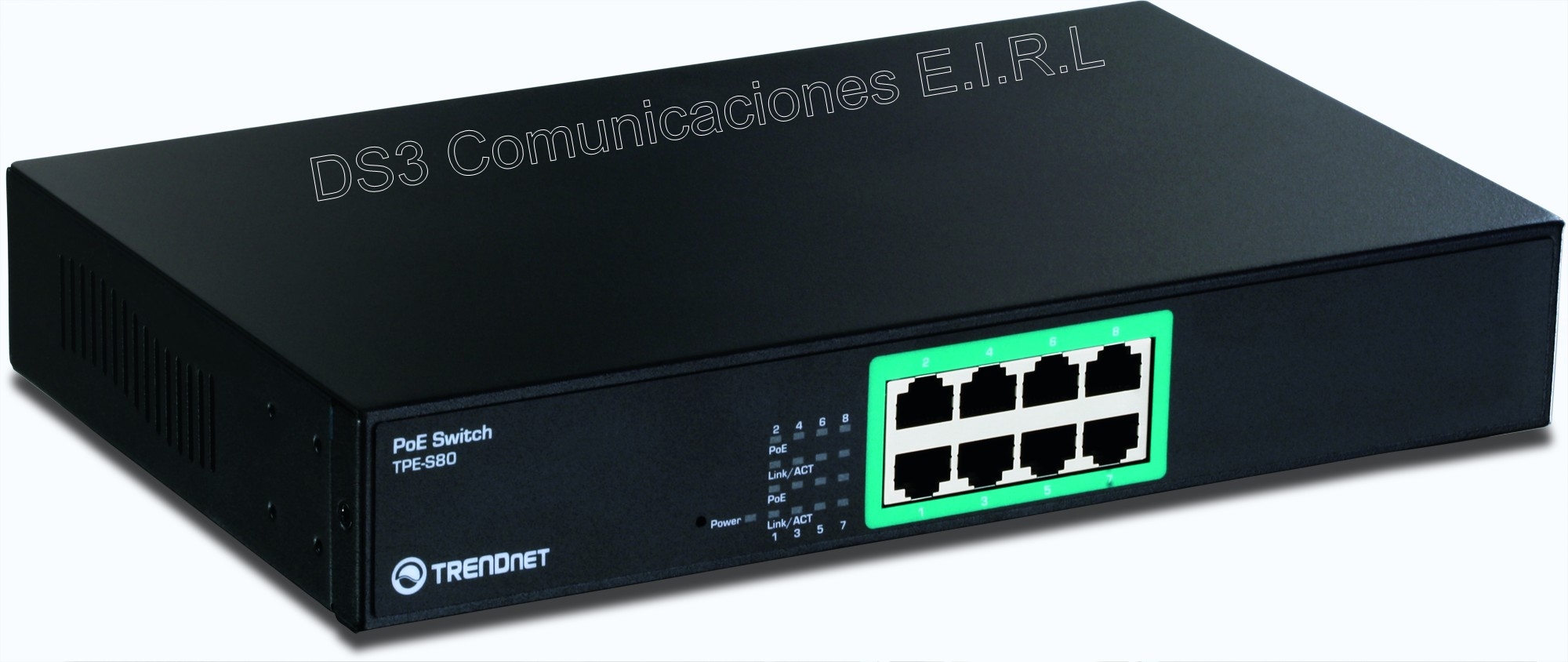 El conmutador de 8 puertos a 10/100Mbps PoE, modelo TPE-S80, reduce los costos en equipos e instalación entregando datos y electricidad a través de los cables Ethernet existentes para dispositivos habilitados para Alimentación por Ethernet (PoE) tales como puntos de acceso y cámaras IP.