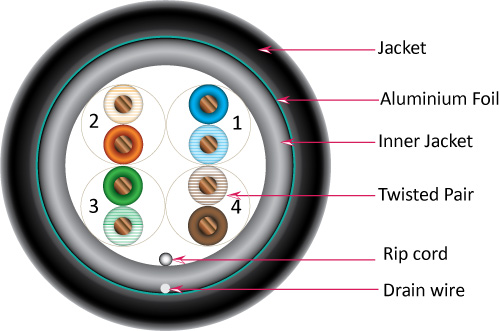 - 24 AWG sólido para exteriores apantallado (foil de alumnio),inlcuye cordon para tierra, chaqueta reforzada